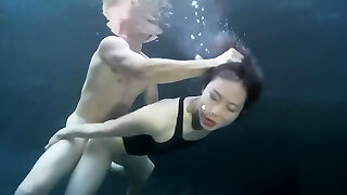 Bare swimming long hair nude diving in body tape underwater water ballet dancing in bare feet