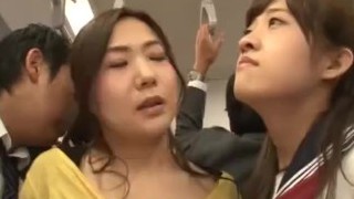 A Married Woman's Breasts Stick to a College Girl's Body on a Crowded Bus! The Wife's Sexual Desire Is Ignited by the Knob