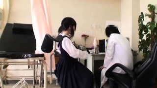 Without taking off her uniform the brunette opens up her legs for his immense Asian creampie